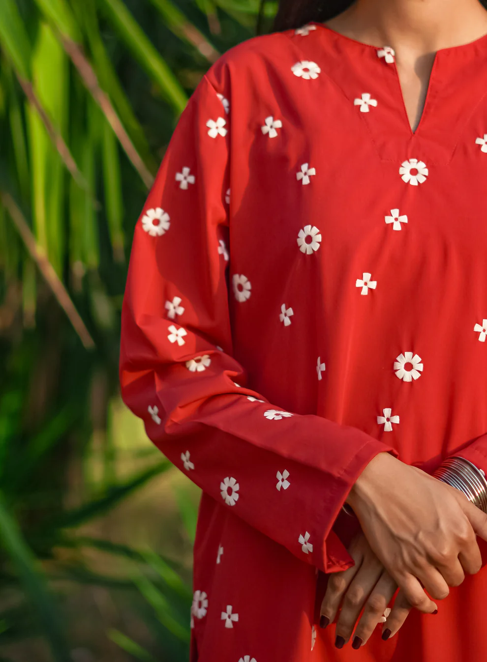 Step into confident charm with AYRA, a bold red cotton ensemble from Kachy Dhaagy. This 2-piece outfit features striking white embroidery that adorns the neckline and sleeves, offering a high-contrast design that’s both eye-catching and elegant. The soft, breathable cotton fabric ensures all-day comfort, while the intricate white threadwork brings a touch of timeless tradition. Paired with a plain red trouser for balance, AYRA is a perfect fusion of vibrance and grace—ideal for festive mornings or evening soirees.
