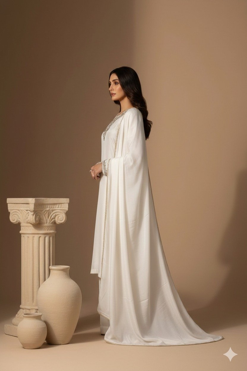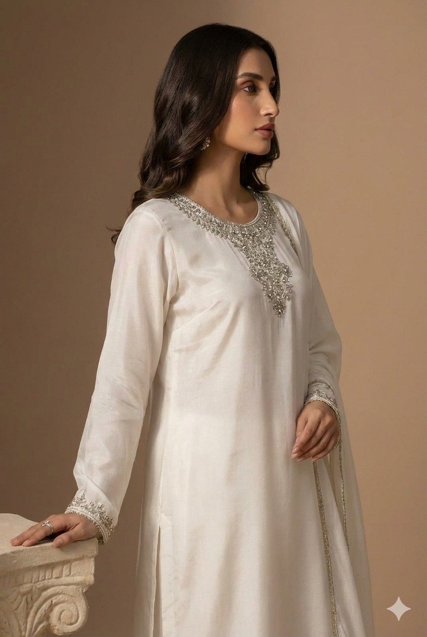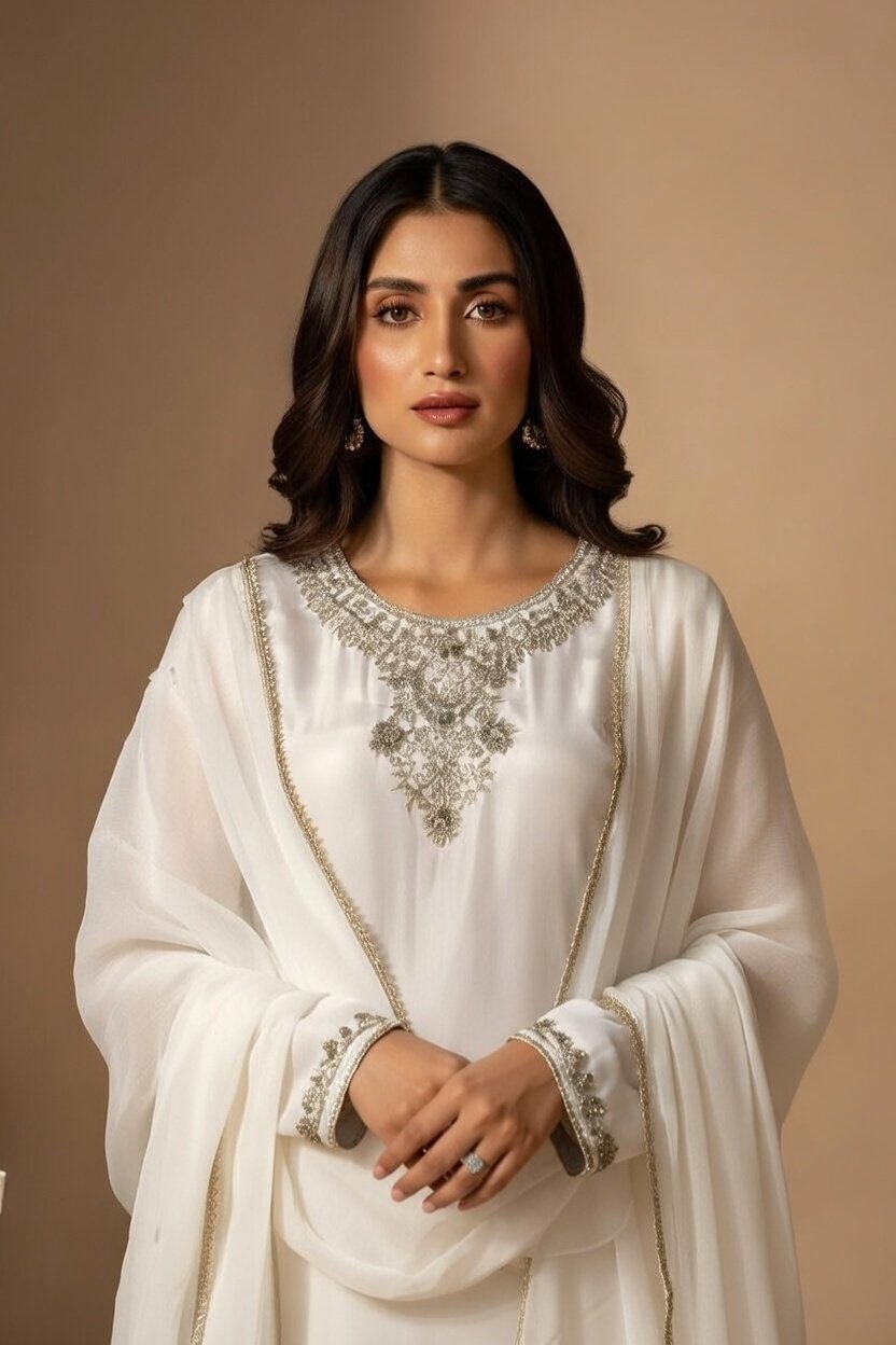 A timeless white embroidered suit with detailed neckline work and a soft flowing dupatta. Perfect for formal events, Eid wear, and elegant gatherings.